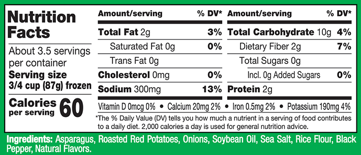 New Green Giant® Restaurant Style Asparagus, Roasted Red Potatoes & Onions are a delicious, restaurant-inspired veggie side dish that’ll make you think you’re dining out. This 10.5-ounce bag of Green Giant Asparagus, Roasted Red Potatoes & Onions includes mouthwatering cuts of veggies and comes perfectly pre-seasoned with sea salt and black pepper.