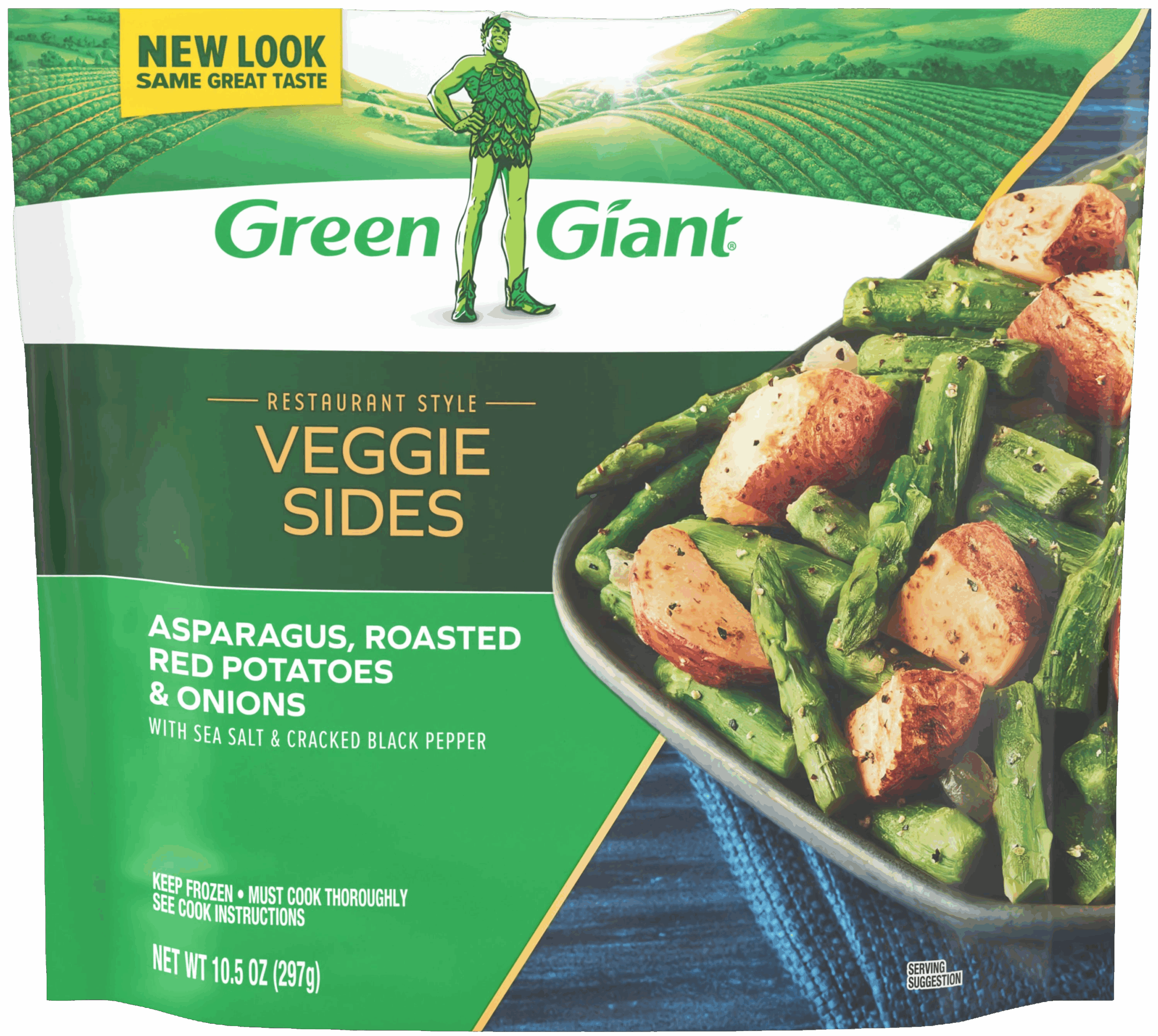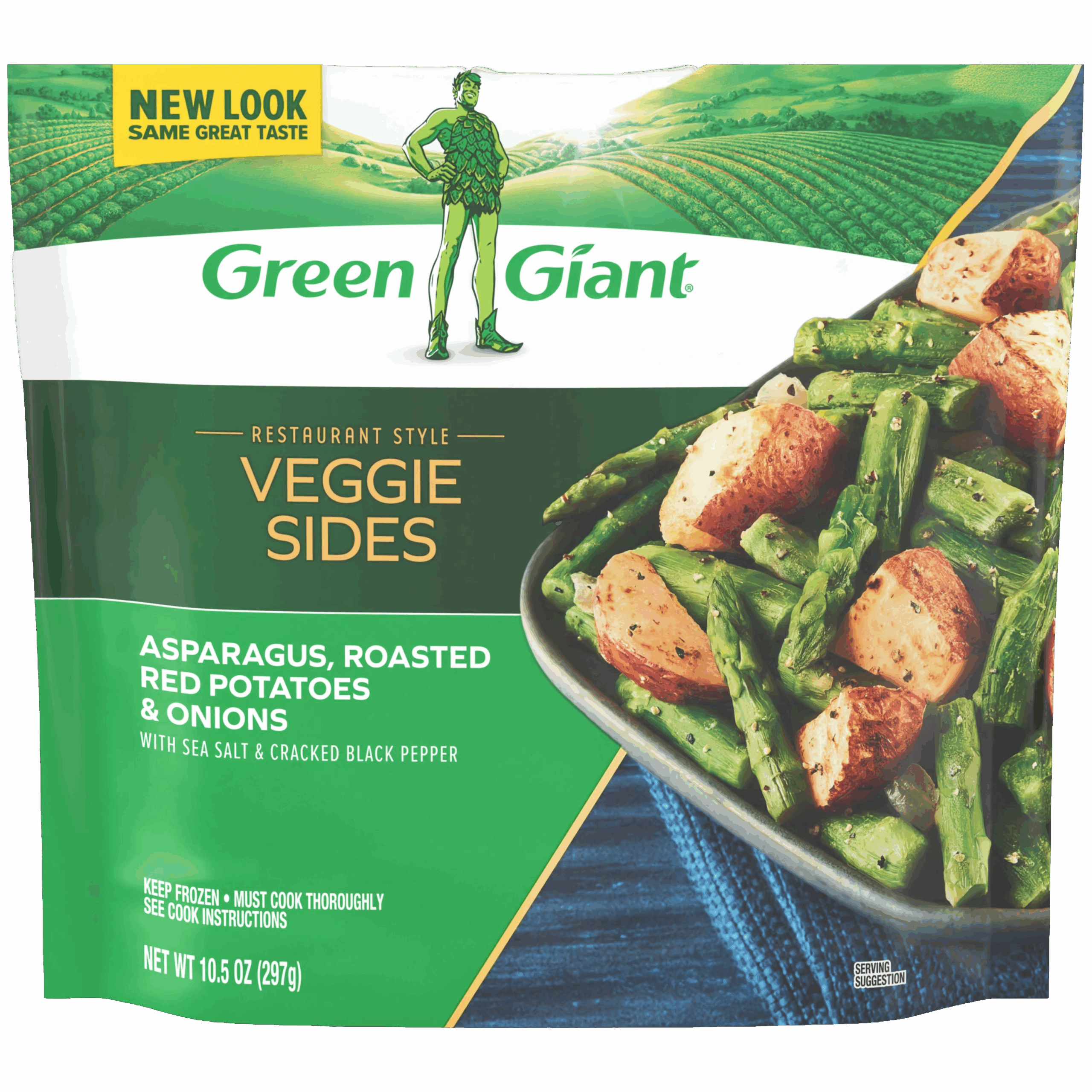 New Green Giant® Restaurant Style Asparagus, Roasted Red Potatoes & Onions are a delicious, restaurant-inspired veggie side dish that’ll make you think you’re dining out. This 10.5-ounce bag of Green Giant Asparagus, Roasted Red Potatoes & Onions includes mouthwatering cuts of veggies and comes perfectly pre-seasoned with sea salt and black pepper.