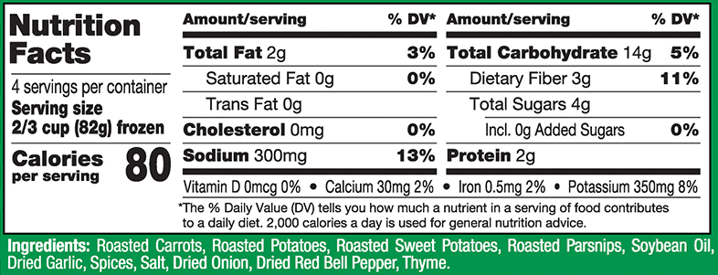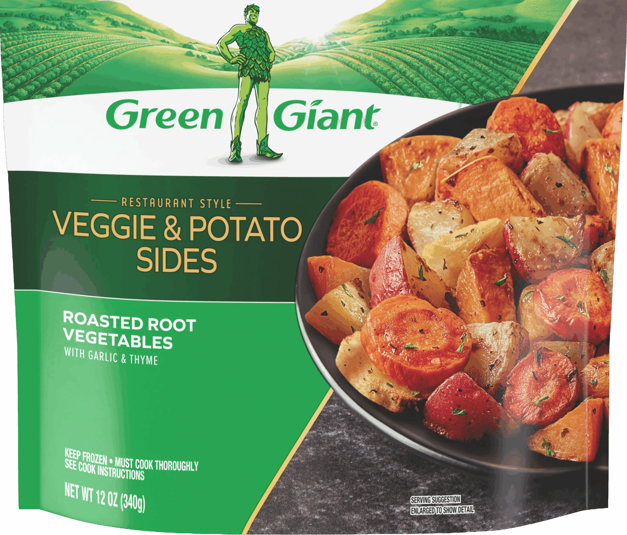 Try the new Green Giant® Restaurant Style Roasted Root Vegetables with Garlic & Thyme for a delectable, restaurant-inspired veggie side that’ll make you think you’re dining out. Roasted Root Vegetables with Garlic & Thyme comes pre-seasoned with garlic and thyme, includes mouthwatering cuts of vegetables and is bursting with bold flavor. Serve as a simple side with your favorite protein.