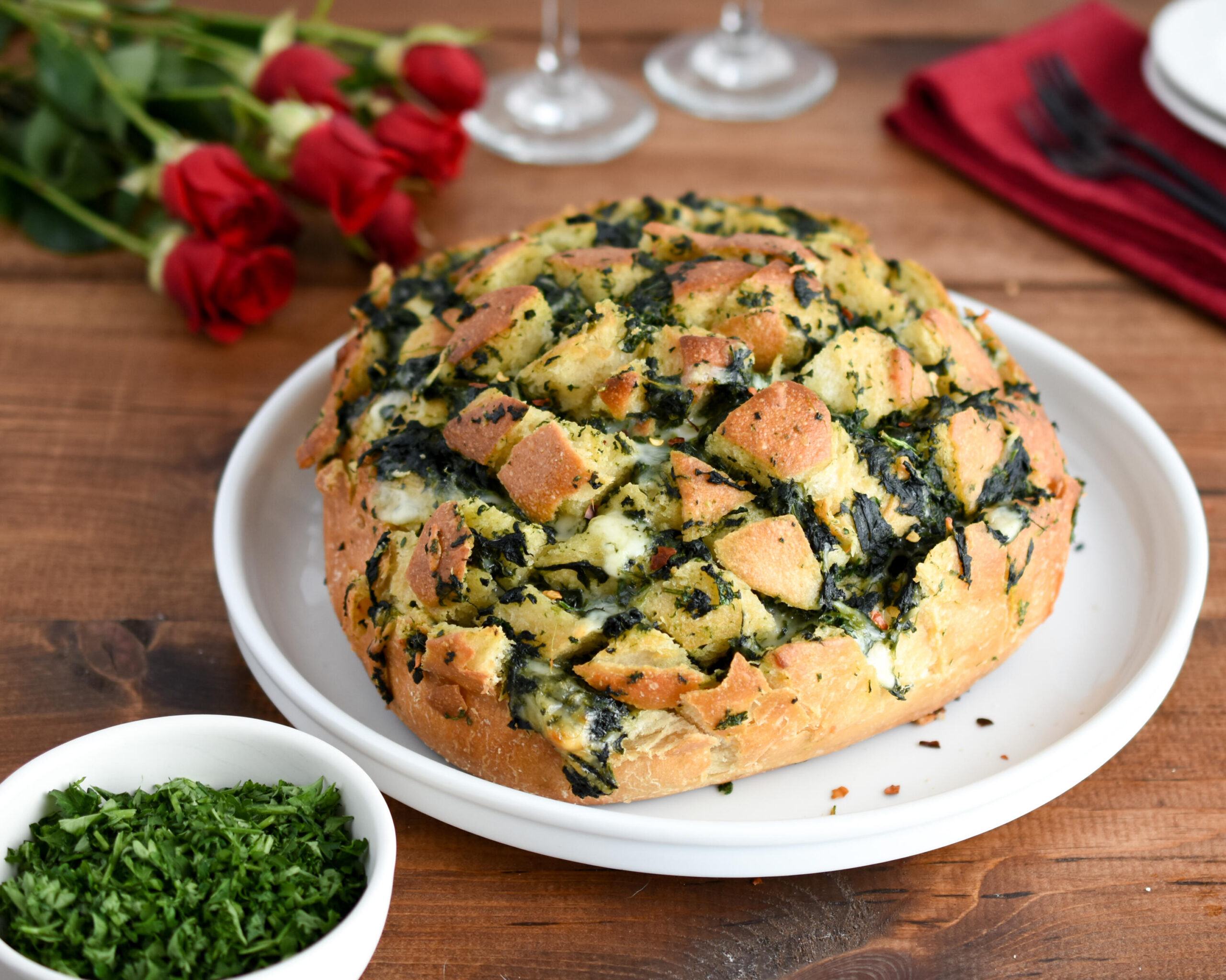 - Stuff the spinach filling into the bread, pressing in between the cuts.