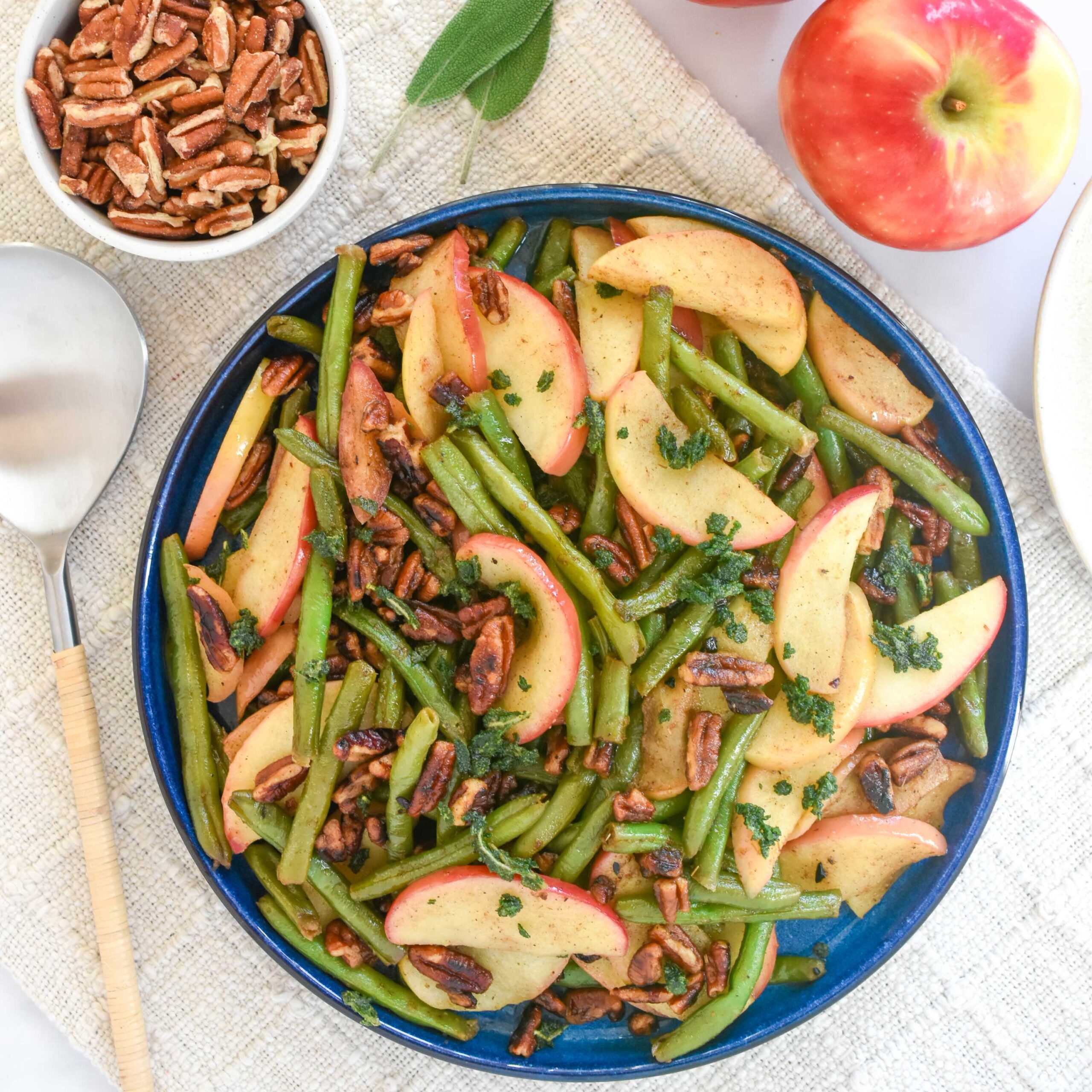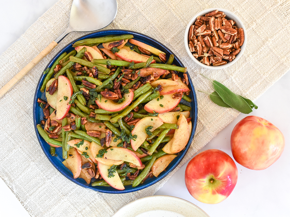 - After 5 minutes, add the apples and pecans to the green beans.